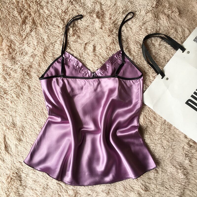 女性のシミュレーションシルクのストラップの上着の半ズボンのパジャマの2つのセットのレースの家の服