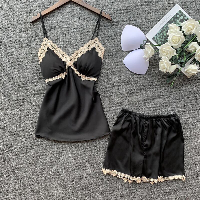 新商品のセクシーなサスペンダーの半ズボンのパジャマの2つのセットのレースの露背のシルクのパジャマ