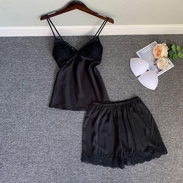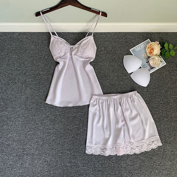 シルクのストラップの半ズボンのパジャマの女性の胸のパッドのレースのパジャマの女性の家庭服のスーツ