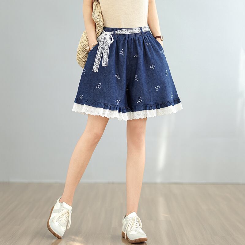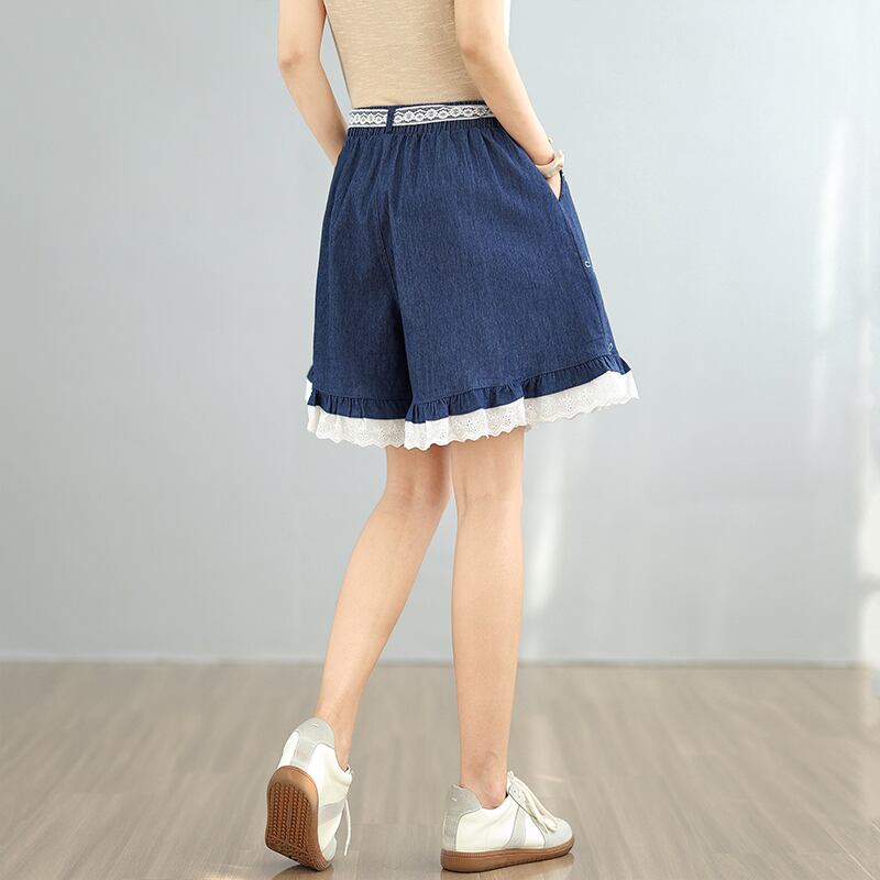 初回送料無料 大きいサイズのレース付きデニムのショートパンツ カジュアル商品