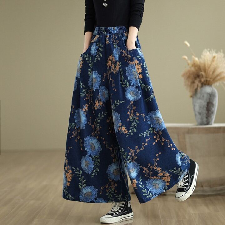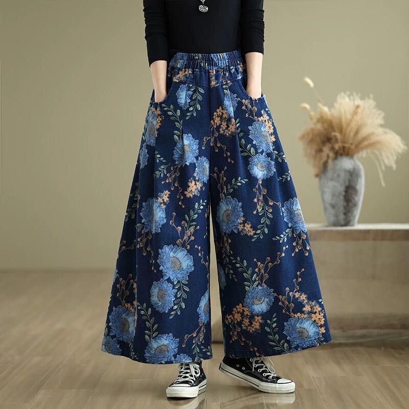 初回送料無料 秋冬レディースファッション カジュアル プリント ストレートデニムワイドパンツ