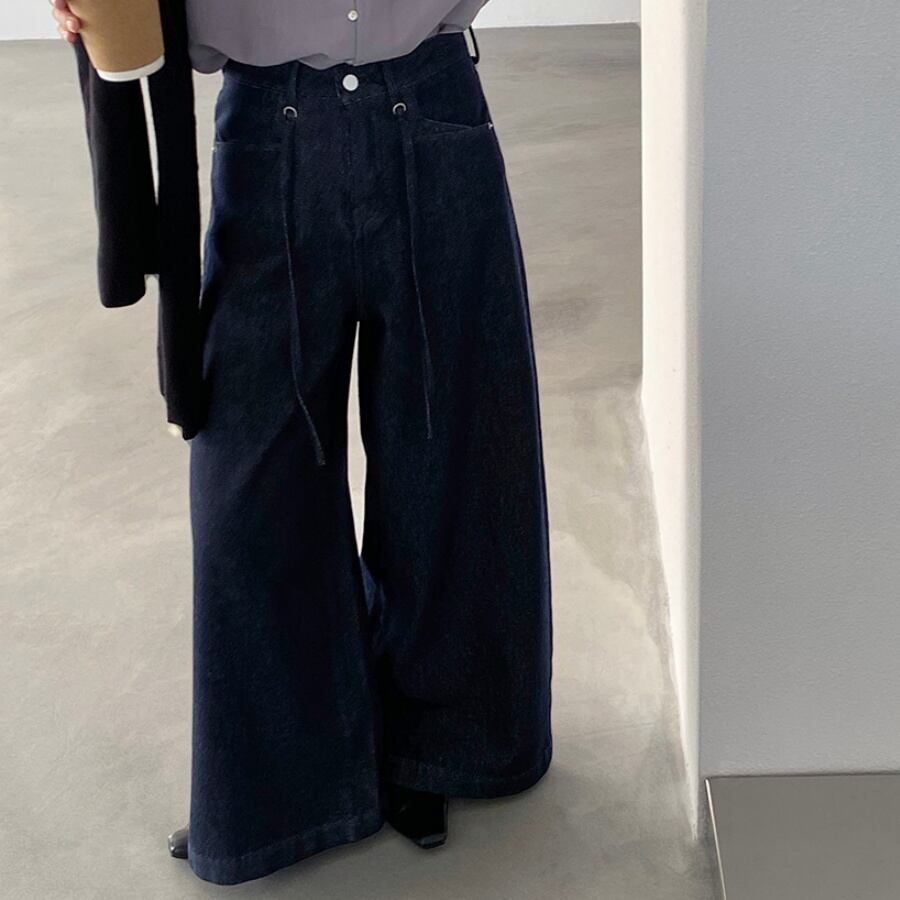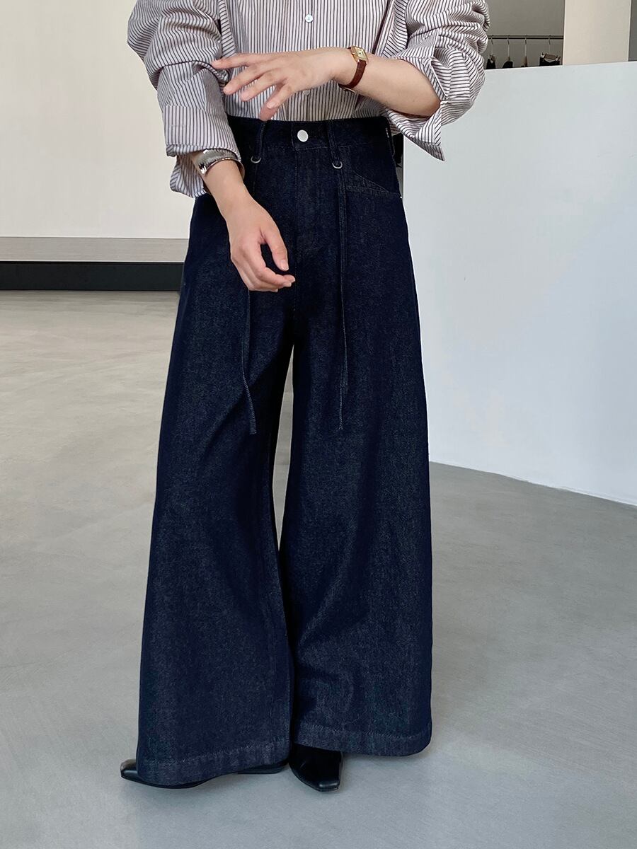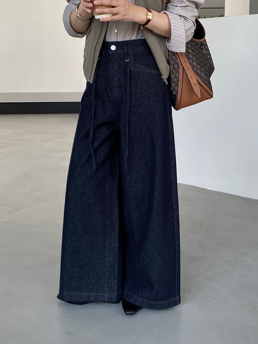 u29228 レトロ ダークブルー ハイウエスト デニムパンツ ストレート ワイド 九分丈 2025秋新作