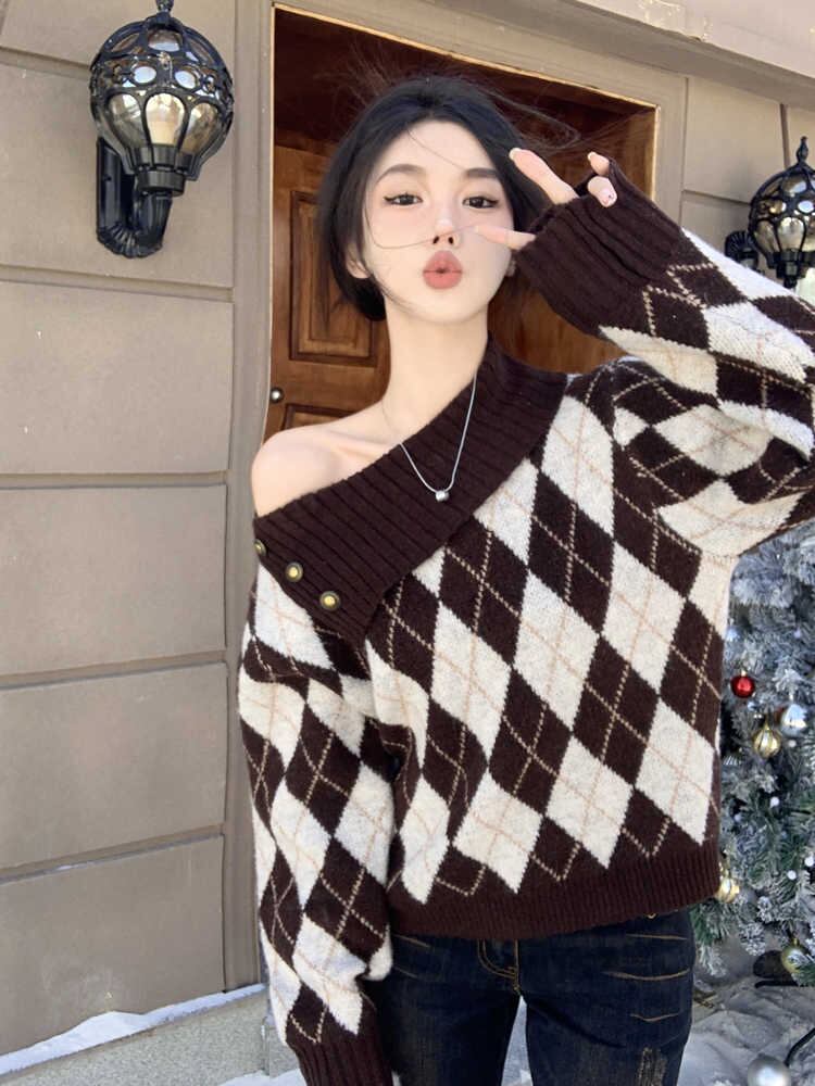 今季マストバイ カジュアル 人気 おしゃれ 防寒 厚手 折り襟 アーガイル カットソー