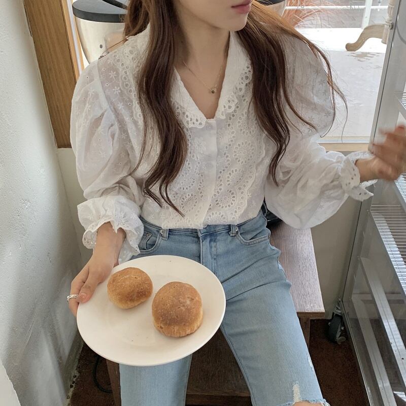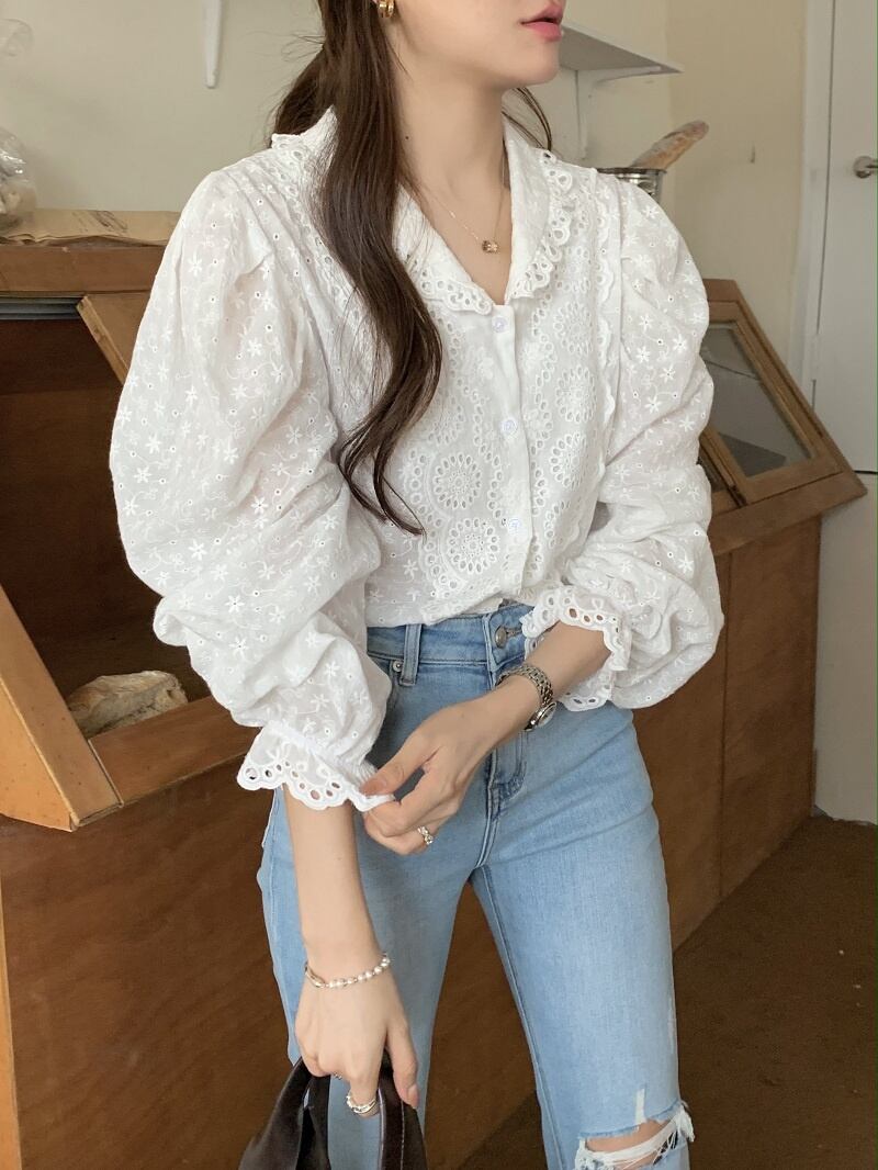 2023春INS★カジュアル 気質 透かし彫り シングルブレスト パフスリーブ シャツ/ブラウス