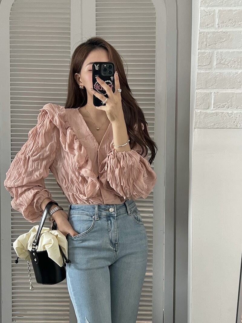 2023春INS★カジュアル 気質 Vネック プリーツ フリル パフスリーブ シャツ/ブラウス