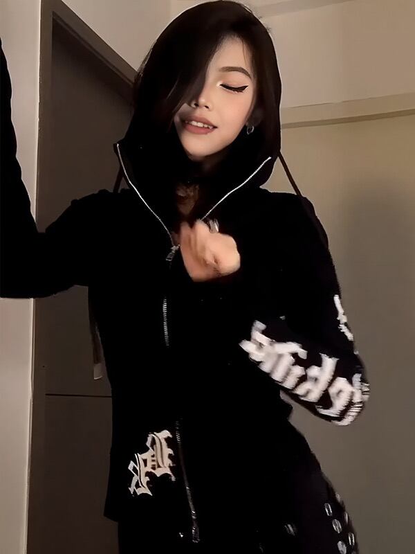 ジップアップフード付き長袖Tシャツ アメカジ プリント ゆったりシルエット