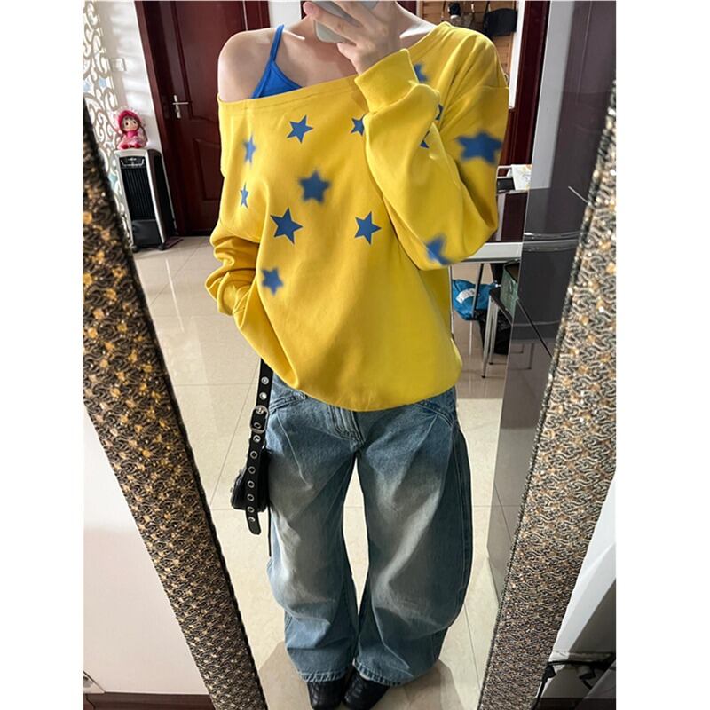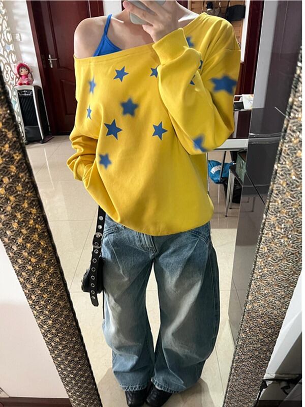 スター柄スウェット 斜め肩デザイン ゆったりシルエット フェイクレイヤードトップス