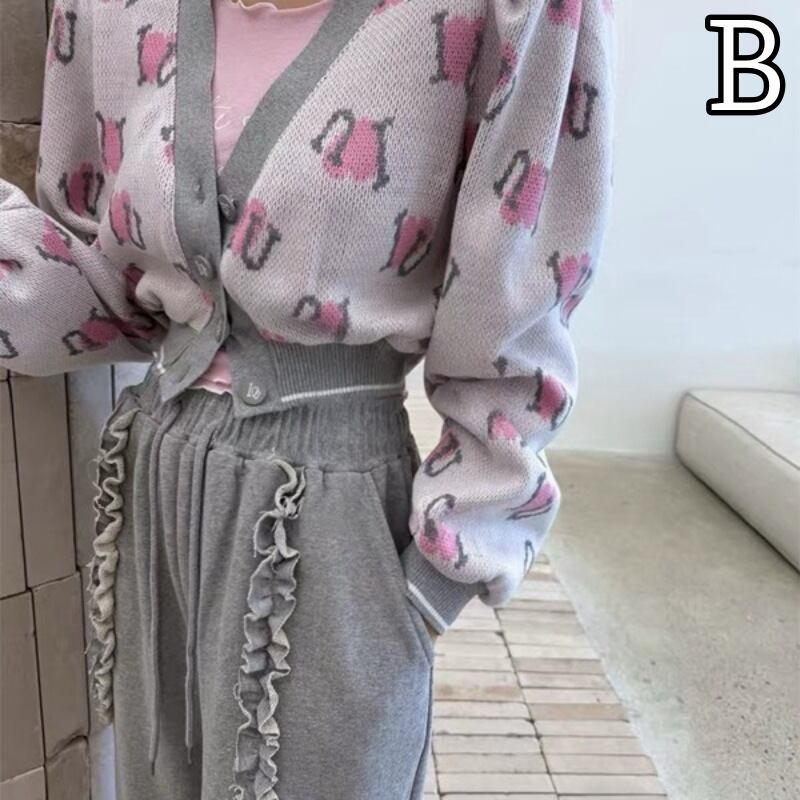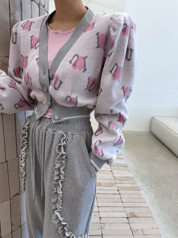 レトロでおしゃれなVネックニットカーディガン 短め丈でどんなコーデにも合わせやすい