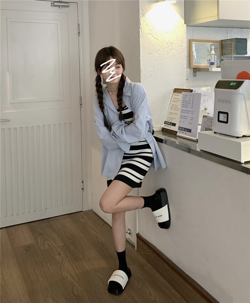 2023夏INS新作★気質ストライプ柄 ベアトップ キャミソール ワンピース +シャツコート セット 韓国風