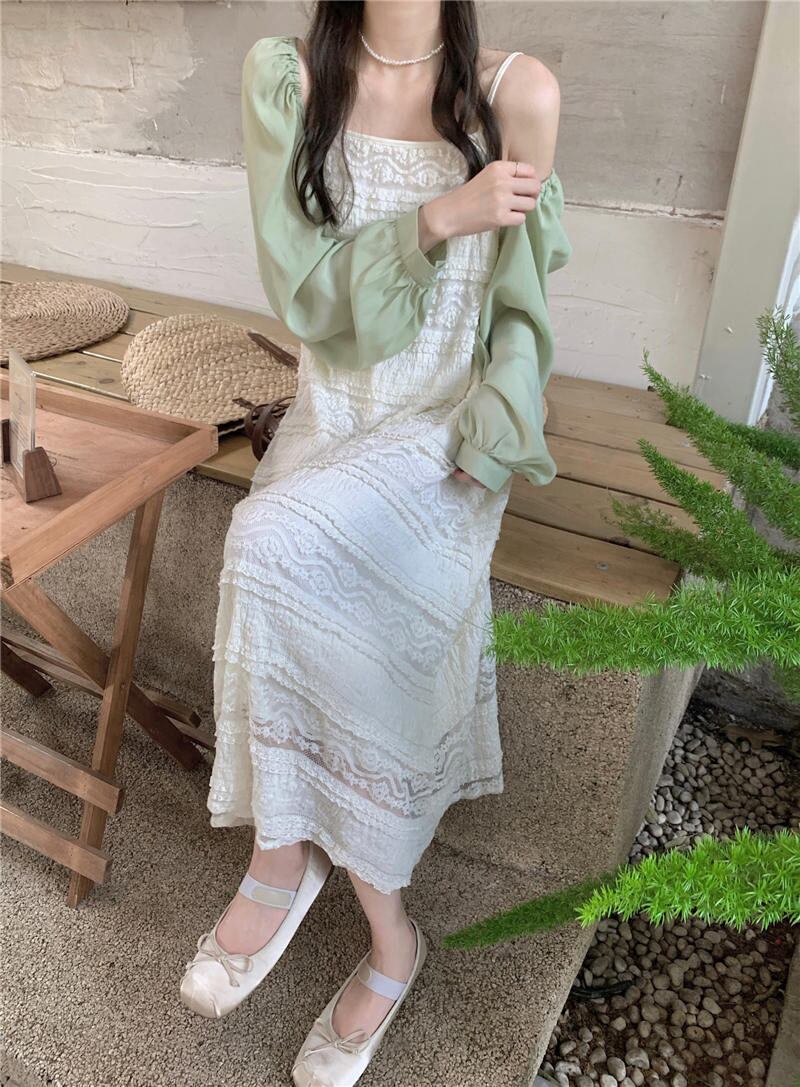 2023夏INS新作★気質 ベアトップ キャミソール ワンピース+透かしブラウス セット 韓国風 スカート
