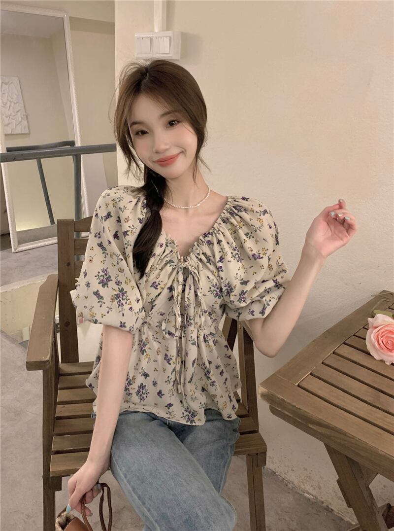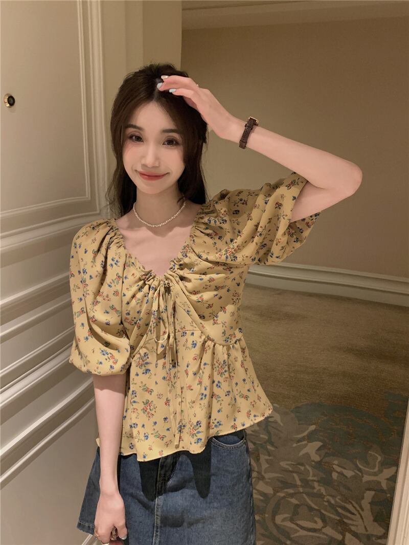 2023夏INS新作★超気質 優しい 着痩せ レトロ 花柄 Vネック シャツ トップス