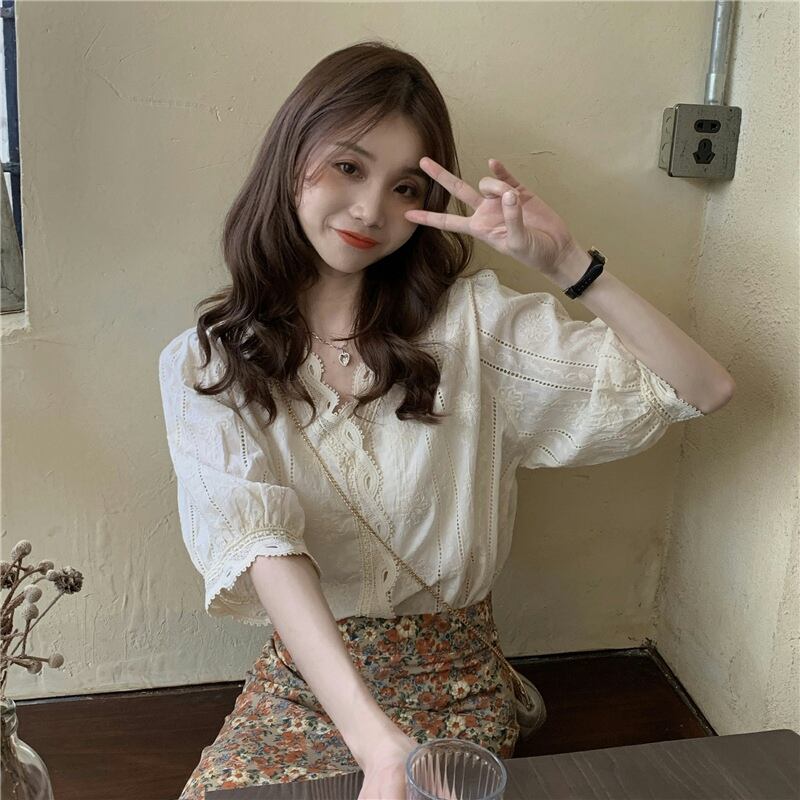 2023夏INS新作★エレガント系 Vネック レース飾り シャツ+セミロングスカート 韓国系