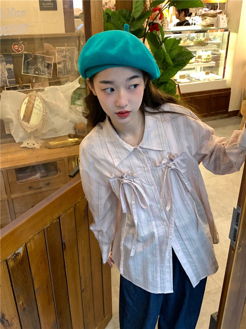 2023春INS★カジュアル 気質 折り襟 リボン 長袖 シャツ/ブラウス