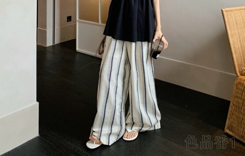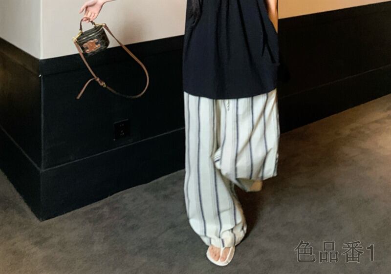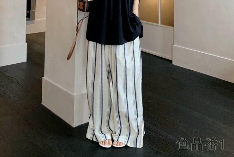 ワイド バギーパンツ 切り替え バイカラー 体型カバー 着痩せ ストライプ柄 カジュアル