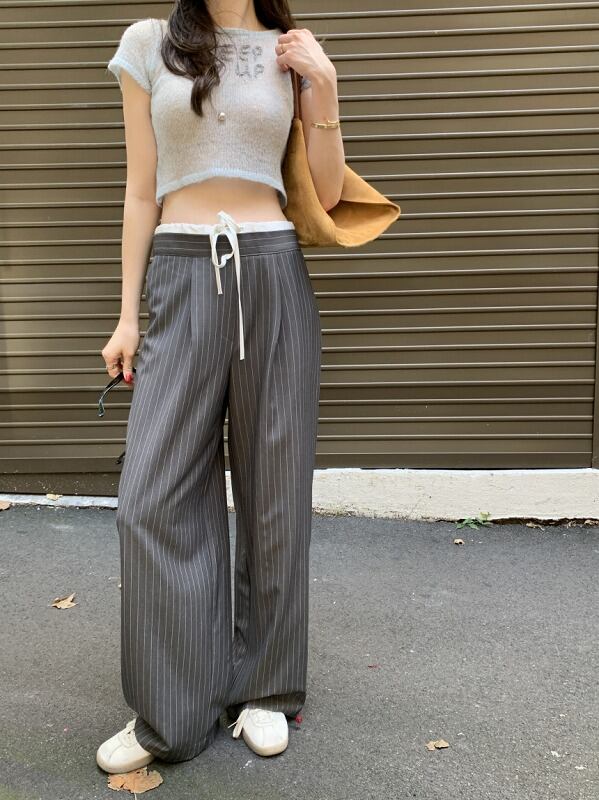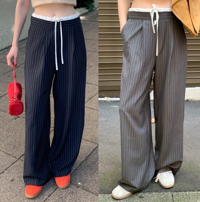 全2色 ワイド バギーパンツ 切り替え バイカラー 体型カバー 着痩せ ストライプ柄 カジュアル