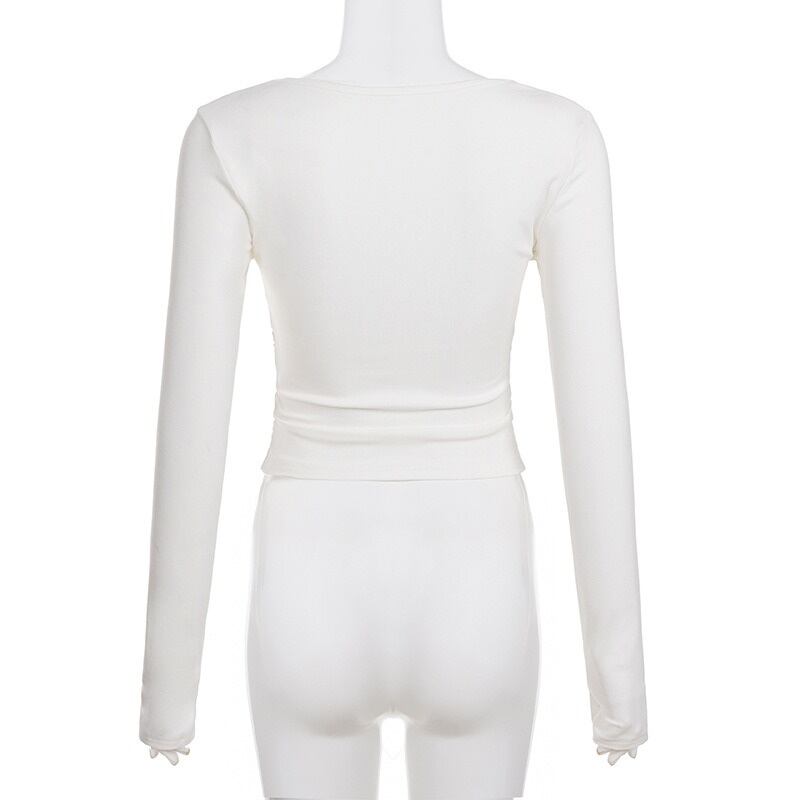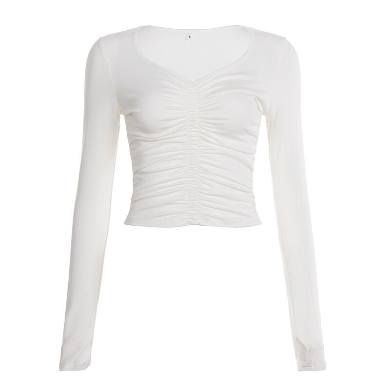 長袖 Tシャツ レディース Vネック ギャザー シャーリング スリム タイト セクシー 無地 インナー