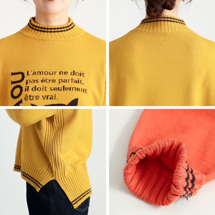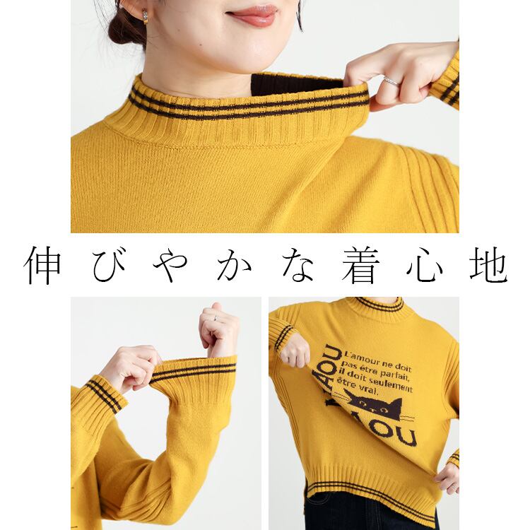 ハイネック配色ロゴ&猫柄ニットチュニック ニット トップス セーター ハイネック お尻隠し 体型カバー