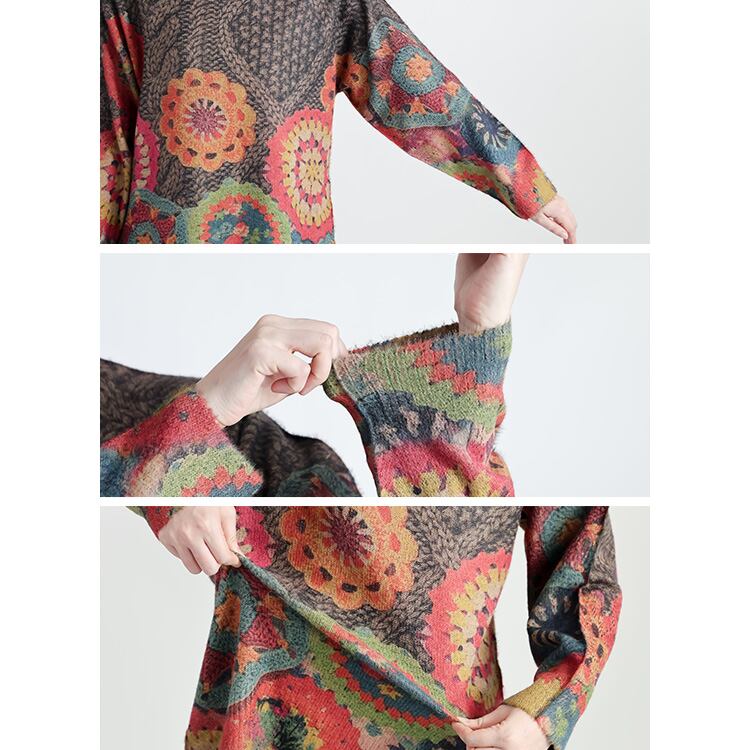 カラフルプリントニット ニット トップス セーター ハイネック お尻隠し 体型カバー チュニック ロング丈