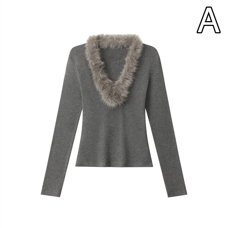 長袖 Tシャツ レディース Vネック ファー襟 タイト スリム 無地 トップス インナー