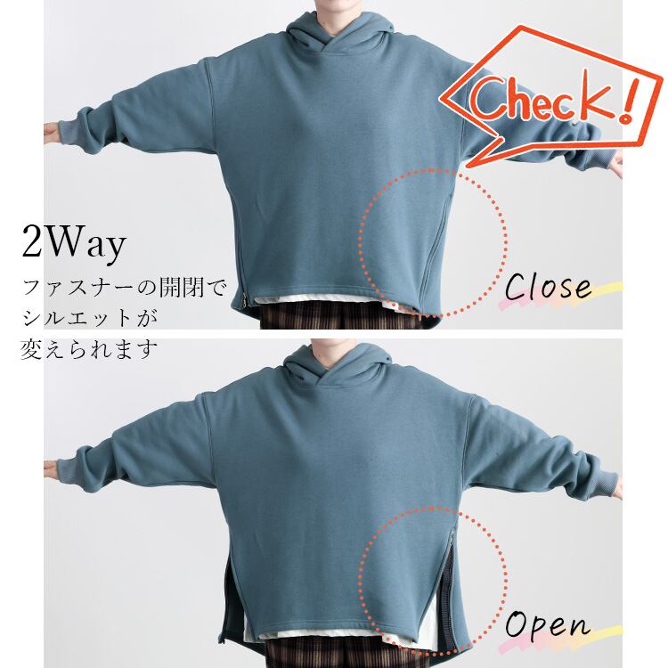 あったか裏起毛!ファスナースリット使いパーカー レディース 体型カバー 寒さ対策 裏シャギー