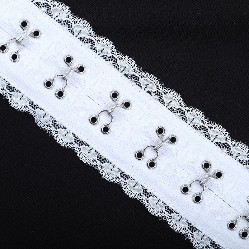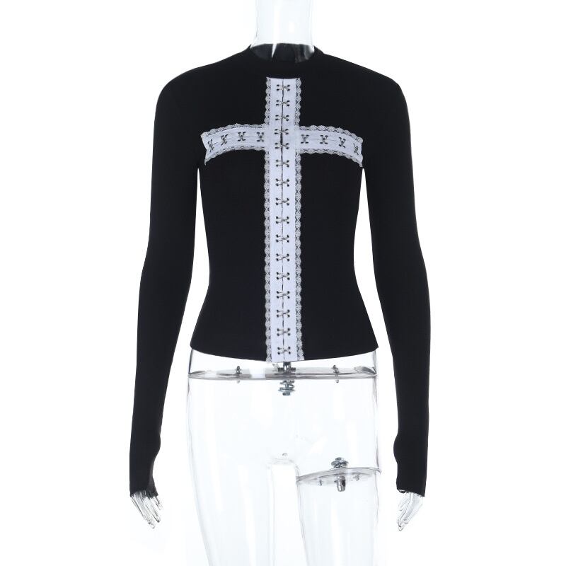 クロス刺繍Tシャツ レディース スリムフィット 長袖 黒 シンプルモード系