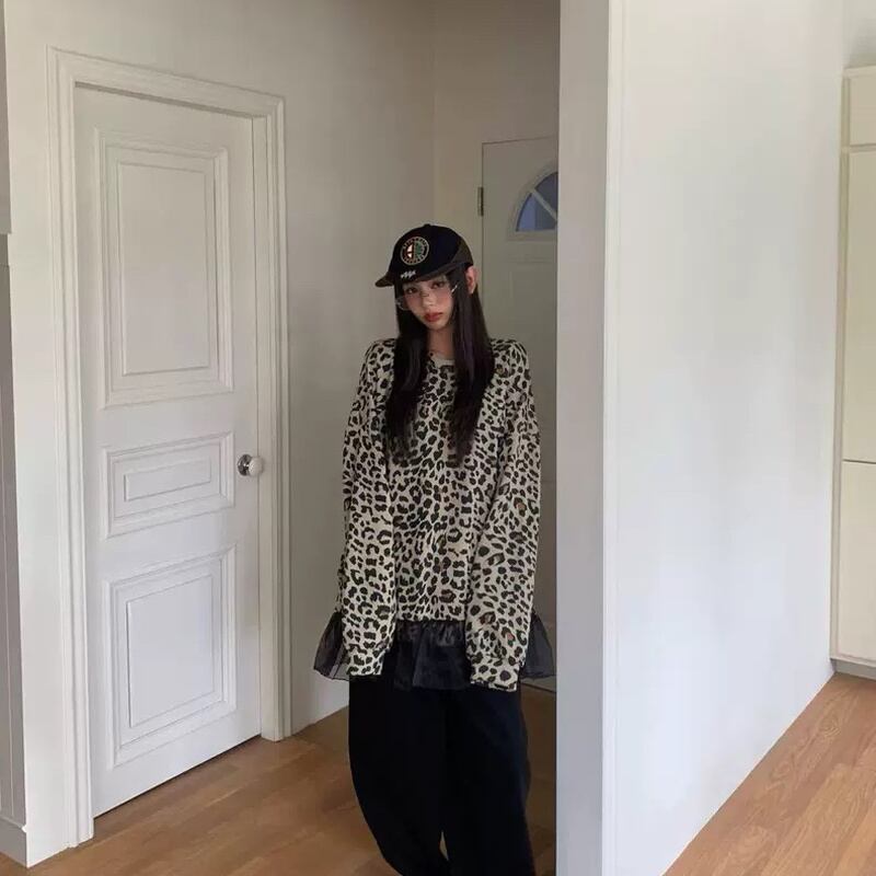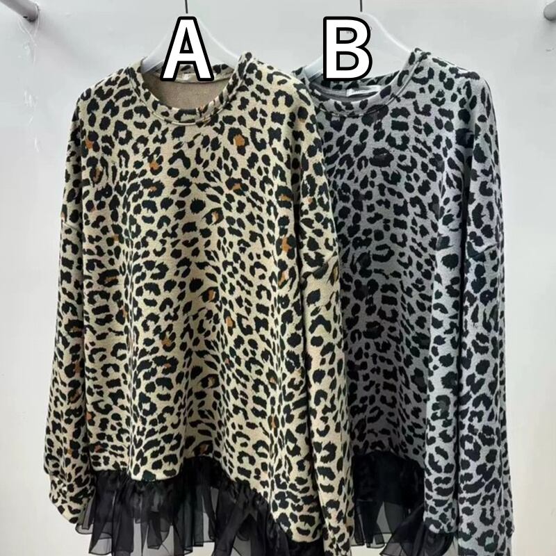 レオパード配色 切替メッシュ スウェット プルオーバー 長袖トップス