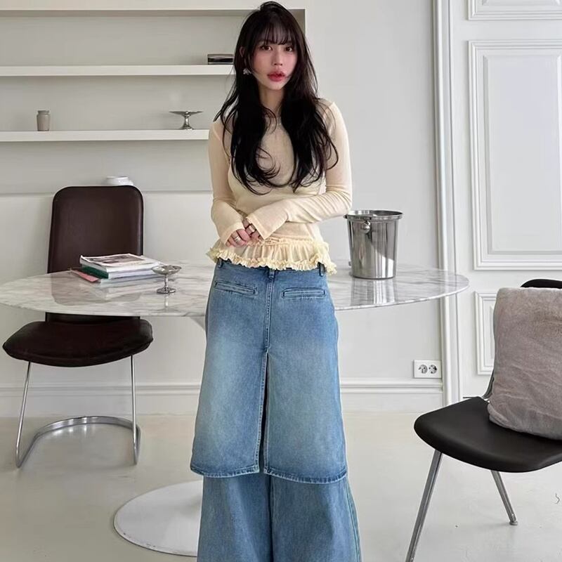フリルメロウ切替 シアーリブTシャツ 体型カバー 細見えインナー