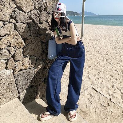 コーデ完成サロペット人気 レディース 紺色の デニムパンツ 体型カバーファッションゆったり パンツ ワイドパンツ