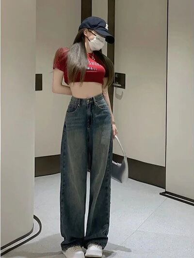 韓国風 レトロ ハイウエスト デニム レディース 夏 ゆったり ヒップ カバー 痩せ見え ワイドレッグ ストレート パンツ
