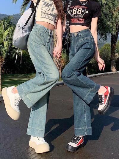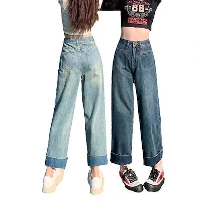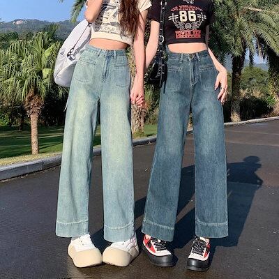 ビッグサイズ レトロ ライト カラー デニム レディース 夏 ハイウエスト 痩せ見え ゆったり 低身長 ストレート ワイドレッグ ロングパンツ