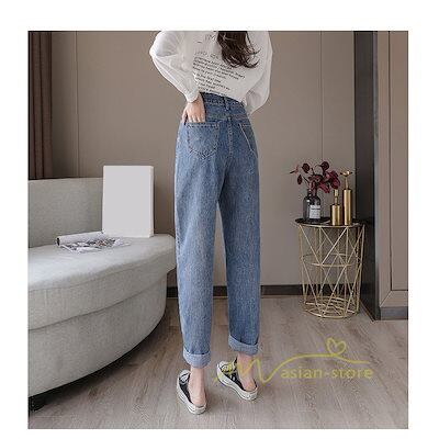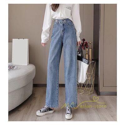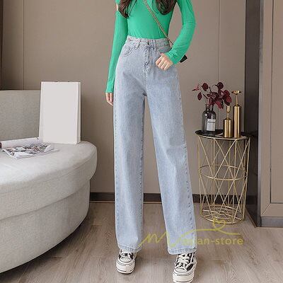 デニムパンツ パンツ レディース デニム ジーンズ ストレッチ ワイトパンツ ゆったり ハイウェスト ロング カジュアル ストレート ジーパン ボトムス 春秋 無地