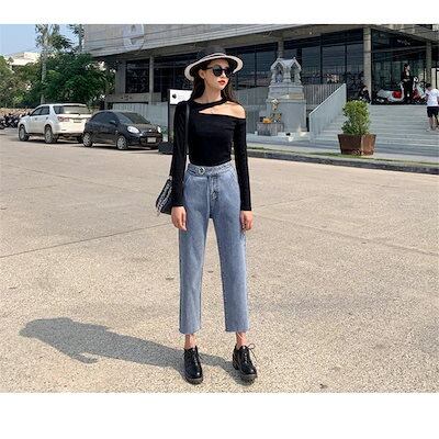 ジーンズ レディースボトムス 2019新作 ストレートパンツ 春夏 九デニムパンツ 大きいサイズ 体型カバー ハイウエスト ゆったり 分丈ズボン カジュアル