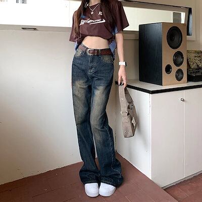 デニムかっこいいスラックスパンツ25 マイクロラッパ デニムパンツ おしゃれレディース ワイドレッグモップパンツ アメリカンレトロ ハイウエストでゆったり 見えやせ 垂れ感