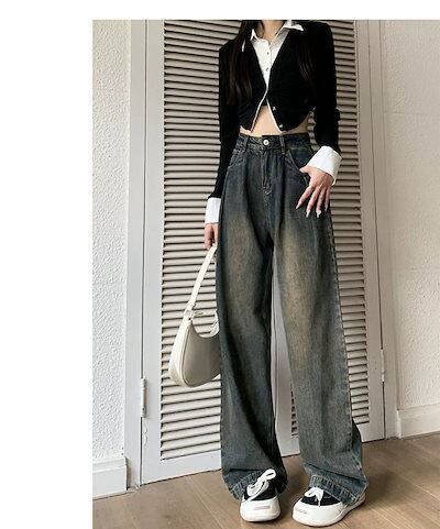裏起毛パンツグレージーンズレトロプリーツワイドパンツジーンズレディースゆったりハイウエスト着痩せ ストレートジーンズひんやりボトムス