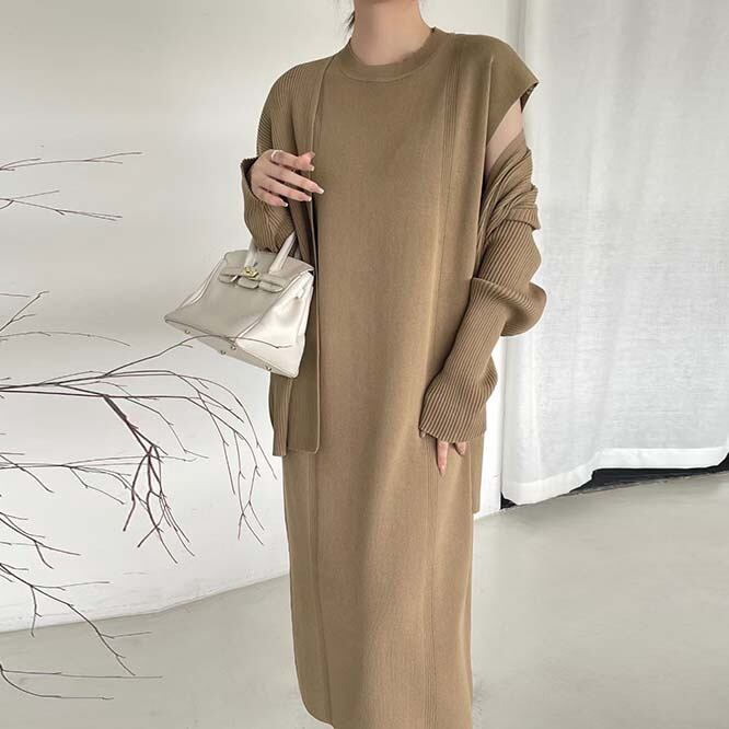 【秋新作】韓国風レディース服 秋 ゆったり 無地 カジュアル きれいめ ニットワンピース&コート セット