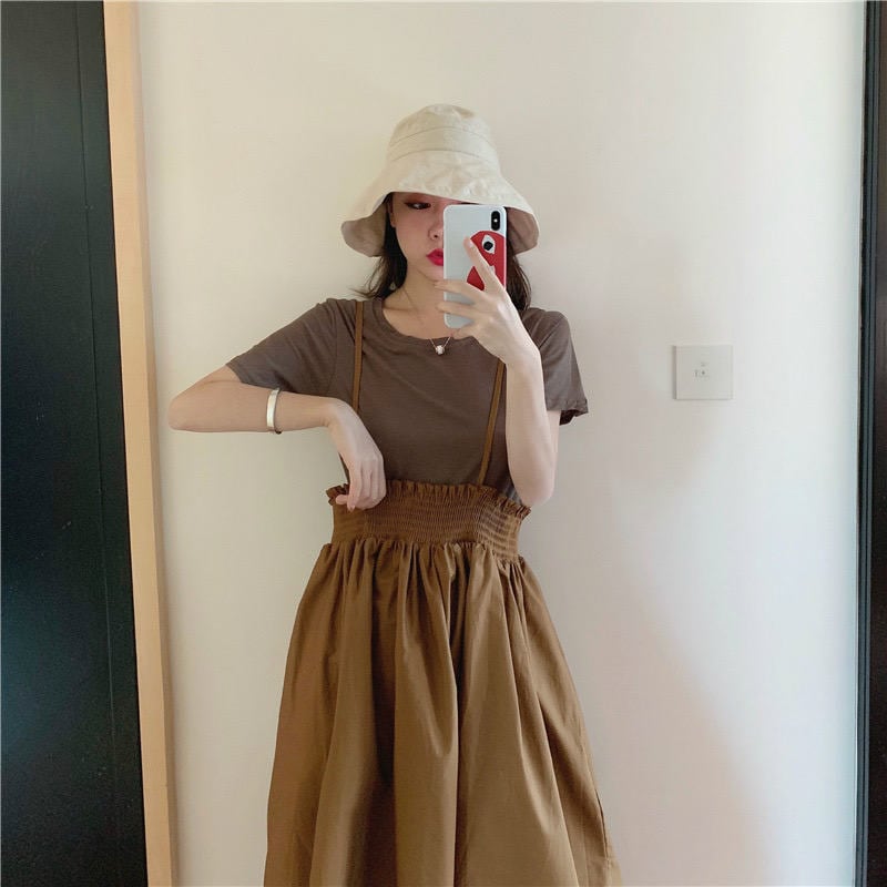 レディースセットアップ上下セット半袖Tシャツカットソーサスペンダースカートミモレ丈フレア無地春夏カジ