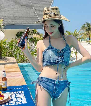 水着 温泉可用 女子ビキニ三角 セバレーツ デニム水着 バストアップカバーアップ水着 2点セット