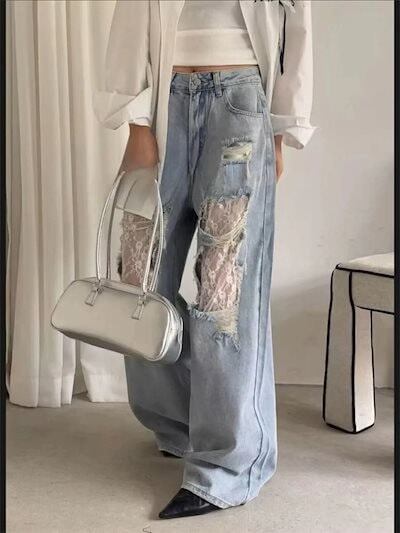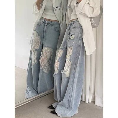 25 デニムパンツ ボトムス ハイウエスト ジーンズ K-PP ストリートファッション系モップ韓国風ファッション練習ジーンズ シルエットゆったりレッグレディースカジュアルジーパン衣装