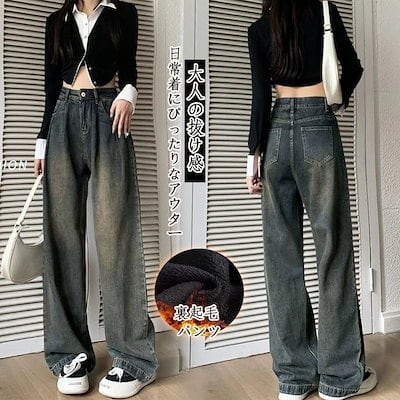 裏起毛パンツグレージーンズレトロプリーツワイドパンツジーンズレディースゆったりハイウエスト着痩せ ストレートジーンズひんやりボトムス