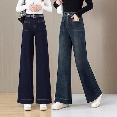 ハイウエスト ワイドレッグ デニム レディース 春秋 ゆったり 痩せ見え レトロ ストレート ロングパンツ