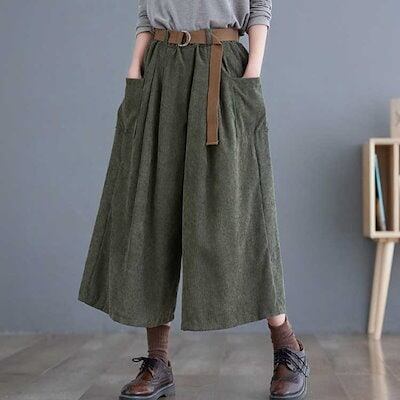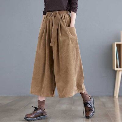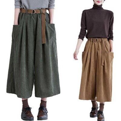 2026年新製品 ベルト付き コーデュロイパンツ レディース 秋冬 ガウチョパンツ ワイドパンツ クロップドパンツ コーデュロイ 七分丈 パンツ ウエストゴム ポケット付き カジュアルパンツ ゆったり