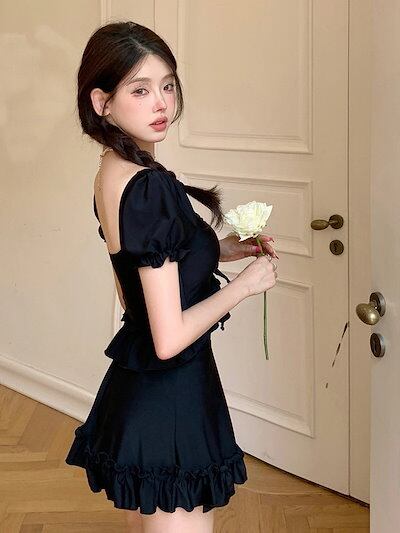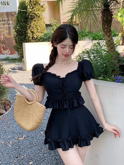 新作 水着 ワンピース水着 2点セットビキニ 体型カバー レディース モノキニ ママ水着 体型カバー水着 フリル 黒 無地 シンプル YY9