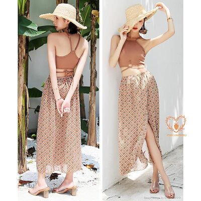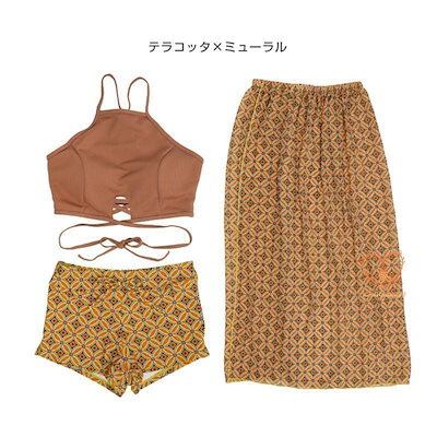 特典水着 レディース 体型カバー ビキニ バンドゥ ック 3点セット エスニック柄 無地 ロングスカート パレオ ママ 体型カバー水着 30代 40代 50代 セパレート