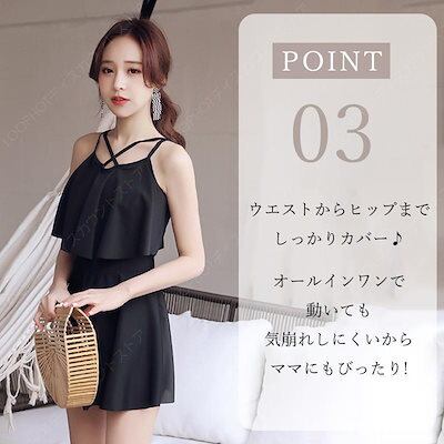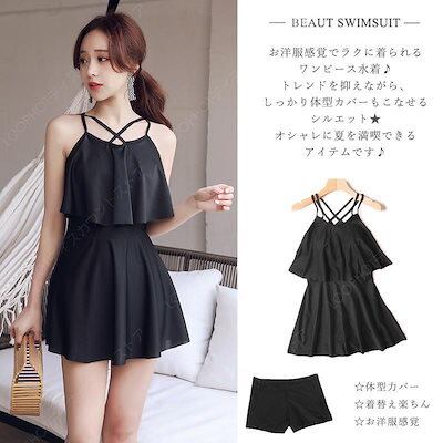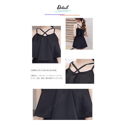 水着 レディース ワンピース オールインワン 体型カバー おしゃれ かわいい 20代 40代 肩出し アシメ 黒 無地 フリルヘム オトナ女子 フレアスカート お洒落-77