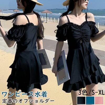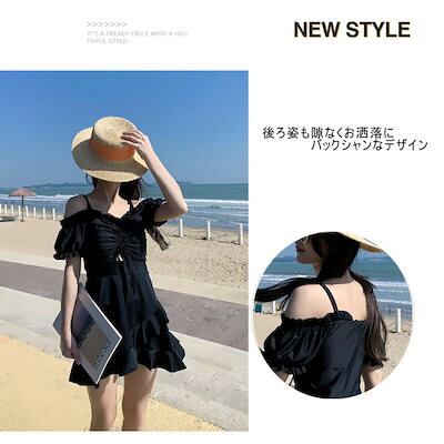 水着 レディース ワンピース 体型カバー 2way 着痩せオールインワン 可愛い フリル オフショルダー 肩出し スイムウェア ビーチウェア 韓国 露出控えめ セクシー おしゃれ 盛れる