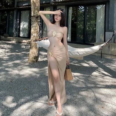 ビキニスーツヨーロッパとアメリカンスタイルの金属プリーツストラップレスベストスリットスリットスリットスリットビーチバケーションビーチスカート
