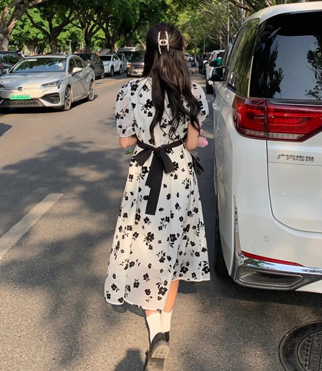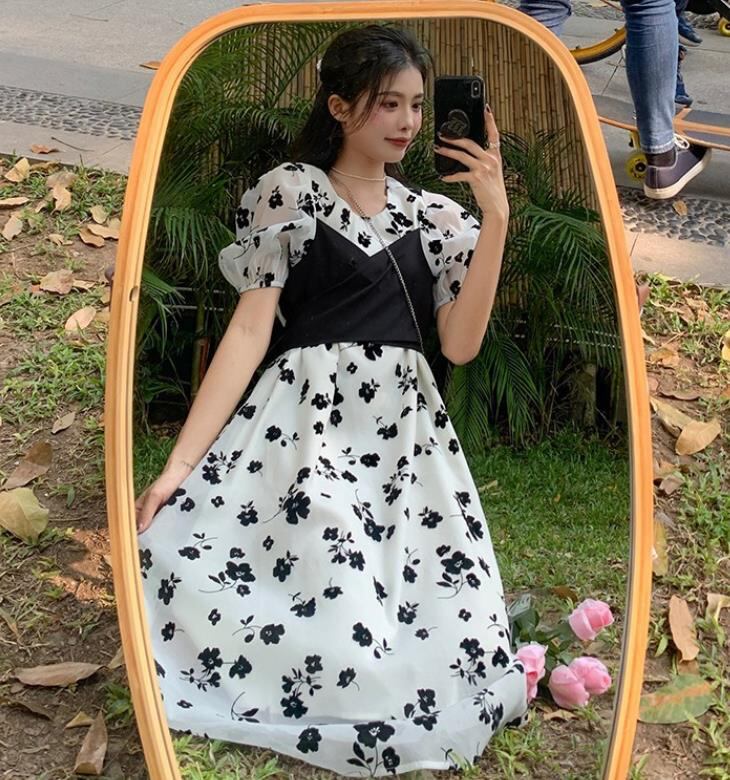 春夏新作 女 レディース ハイウエスト 半袖 花柄 ロング ワンピース 台型スカート S-LEERMJNB3697016