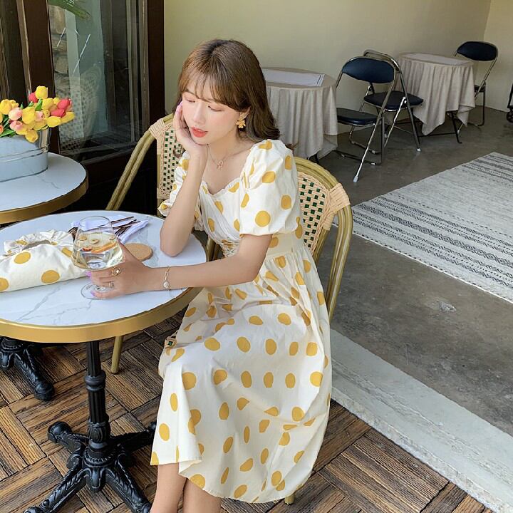バック付き半袖ワンピースフラットネック水玉ロングワンピース FBB62559