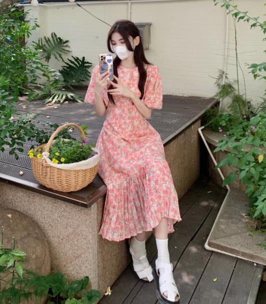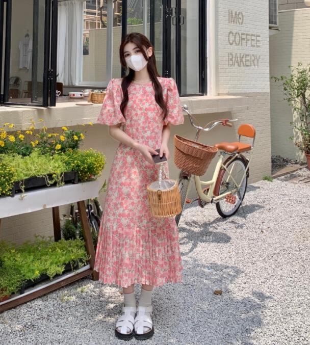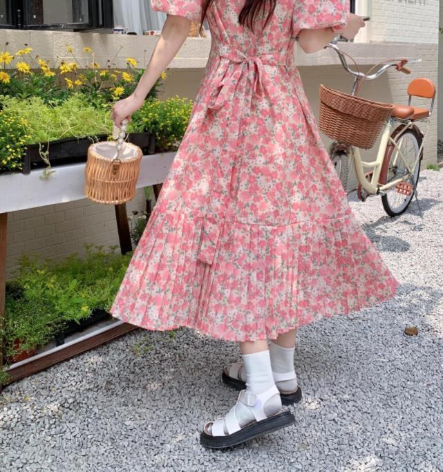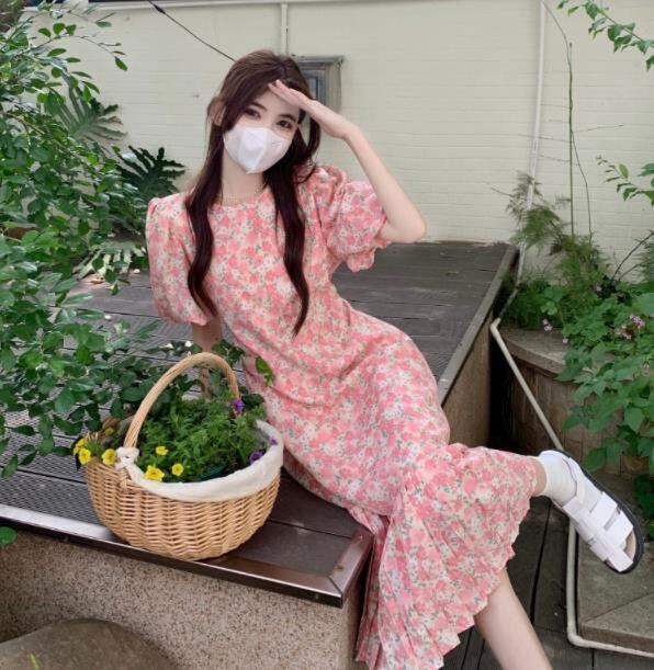 春夏新作 女 レディース ハイウエスト 半袖 花柄 ロング ワンピース 台型スカート S/M★# GYKDQQ639874