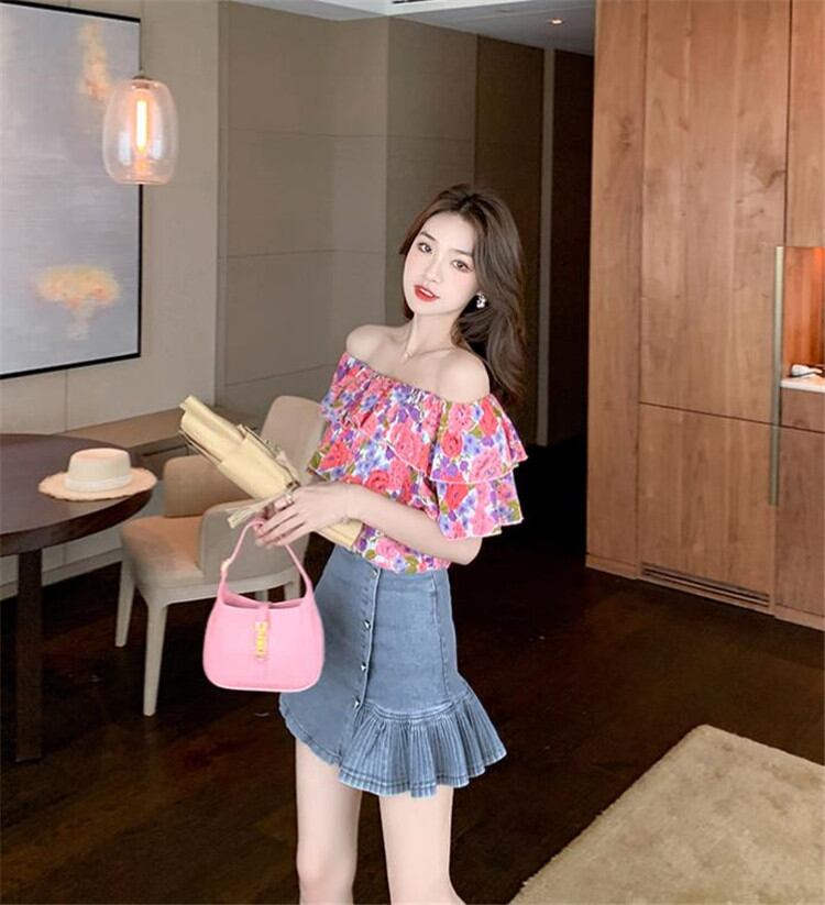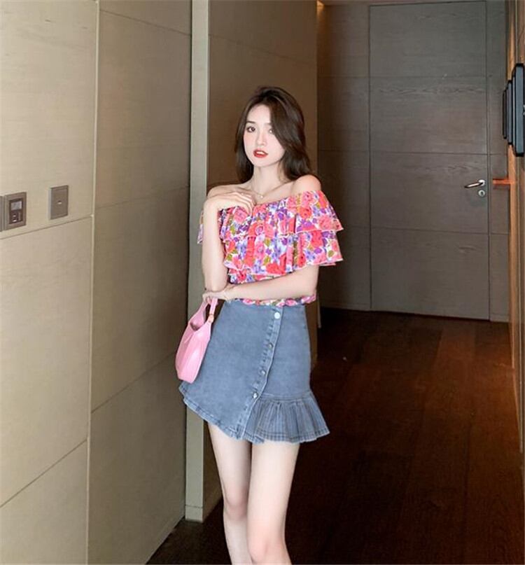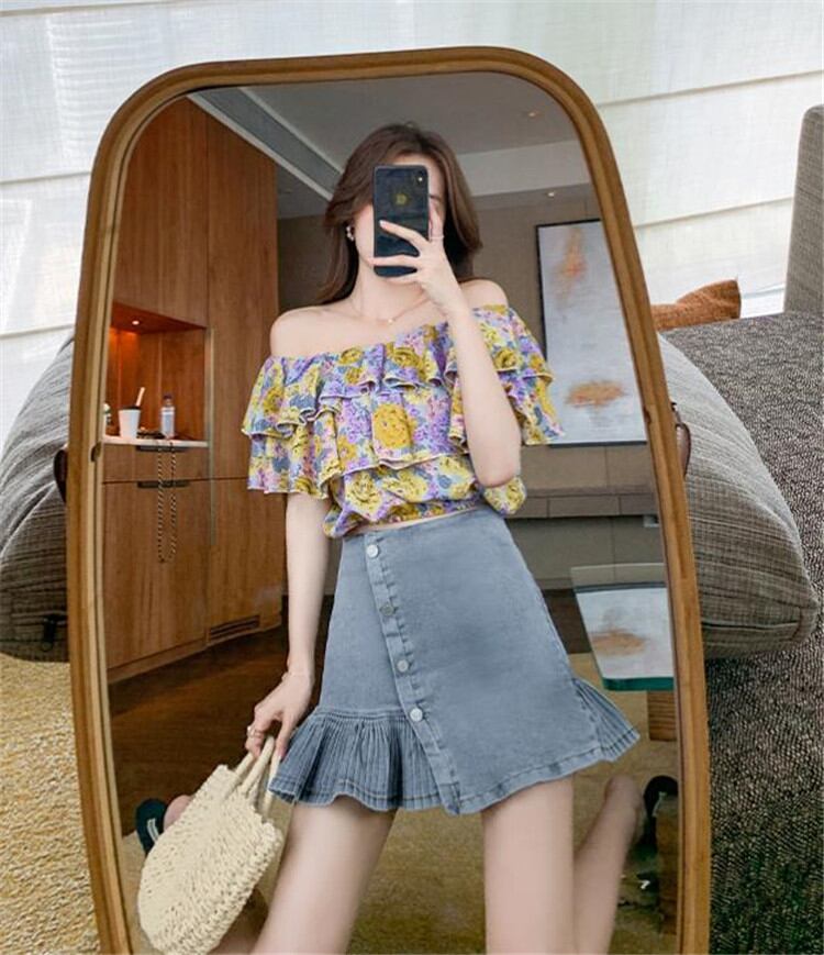 INSスタイル デニム ショートスカート ハイウエストイレギュラー スリム Aライン